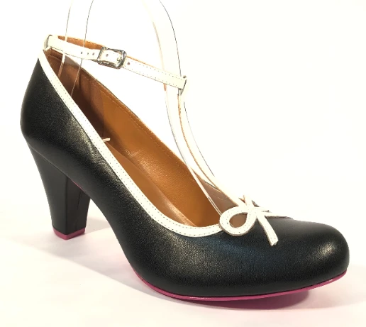 This delightful vintage inspired heel by Cristofoli will be an investment staple in your wardrobe. It is in a versatile black leather and is trimmed with a contrasting white leather. It has an adjustable ankle strap with t-bar and a sweet delicate bow embelishment on the toe
