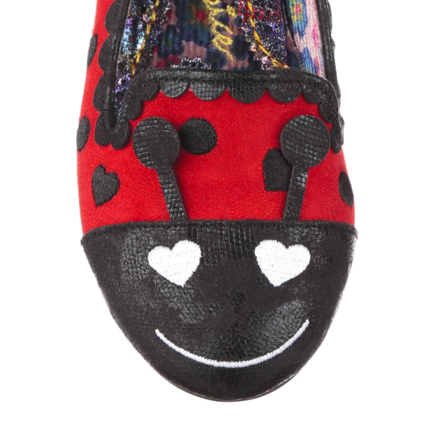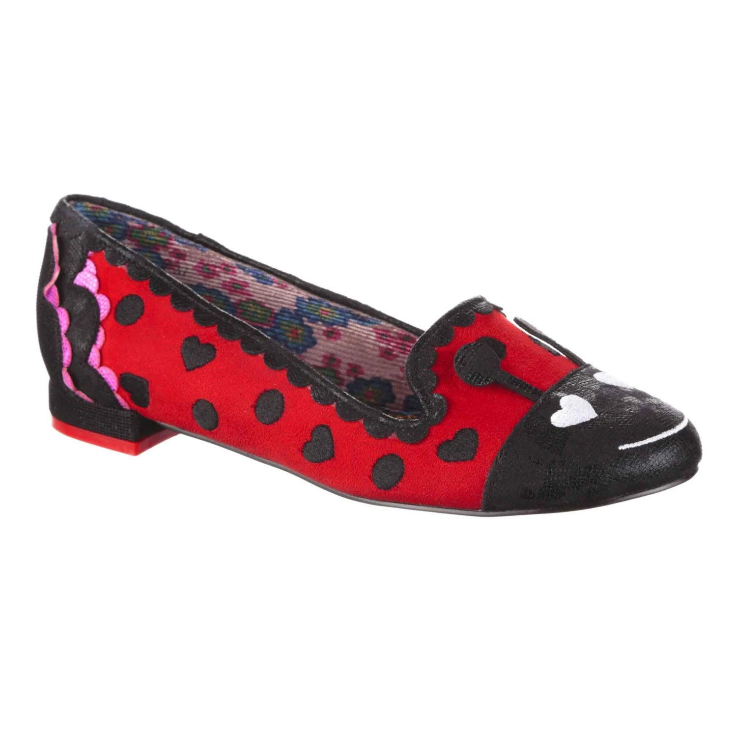 Aren’t these so cute?! These ladybug flats are made of red suedette, and have a cute little bug face on the toe! Spots and hearts are embroidered along the length of the shoe, and pink and black scalloped details decorate the heel of the shoe. The antenna of the ladybug can lie flat, or sit up for more impact! Catch them today, before they fly away!