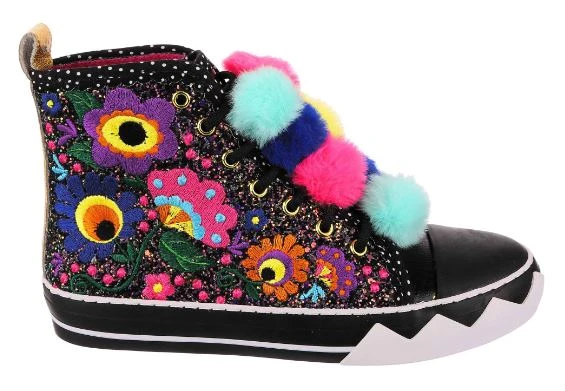 Have a party on your feet with these beauties! Multicolour pompom covered laces criss-cross up these sneakers which are fabulously embroidered all over! Backed onto a black shimmering glitter and paired with our comfortable flat sole, they are sure to be an instant wardrobe fave!