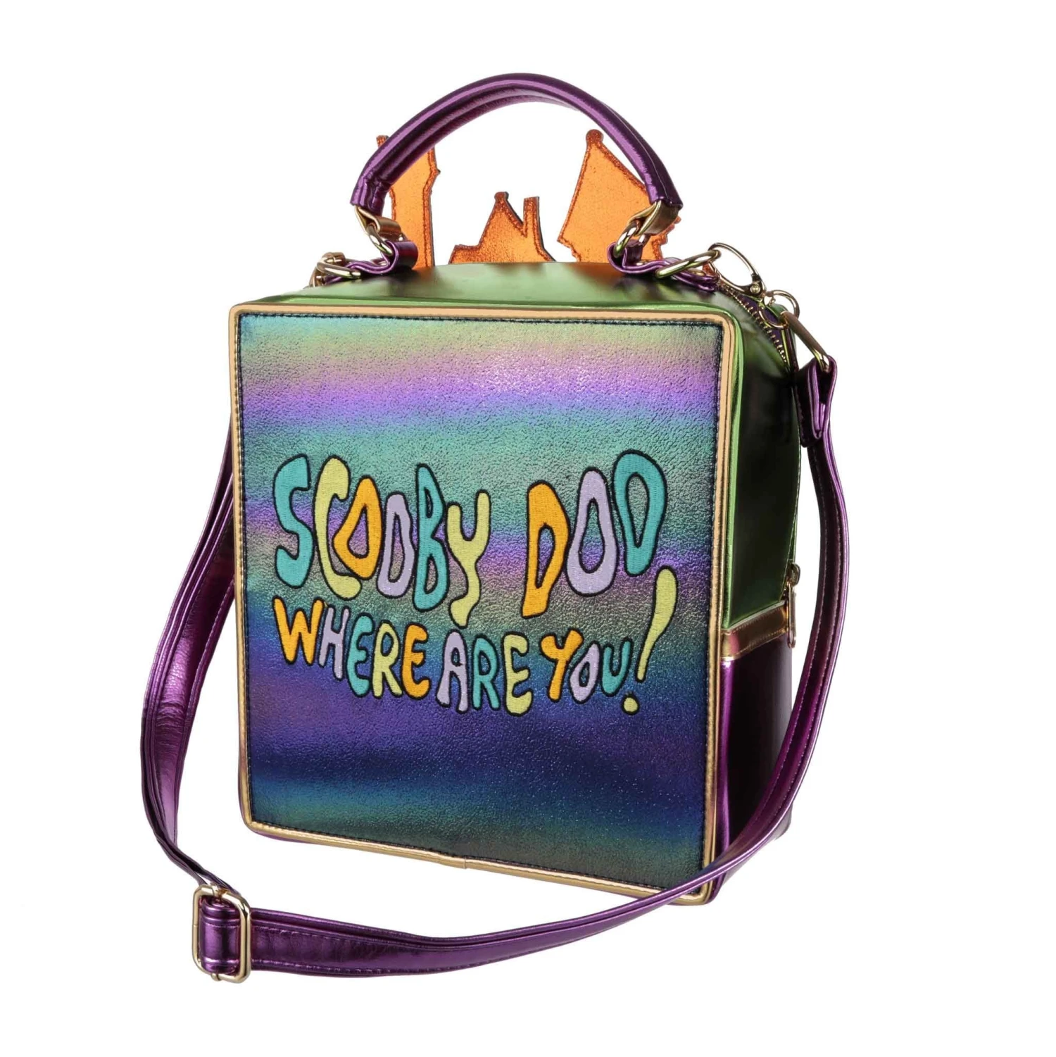 Run gang! Filled with all the fun of a spooky monster chase, this bag features a striking black glitter house silhouette, shimmering metallic windows and a tombstone, and all of the Mystery Inc gang running away! Fully lined and roomy, this bag also features a handle, as well as a removable and adjustable over the shoulder strap! So what are you waiting for? Grab it before it runs away!