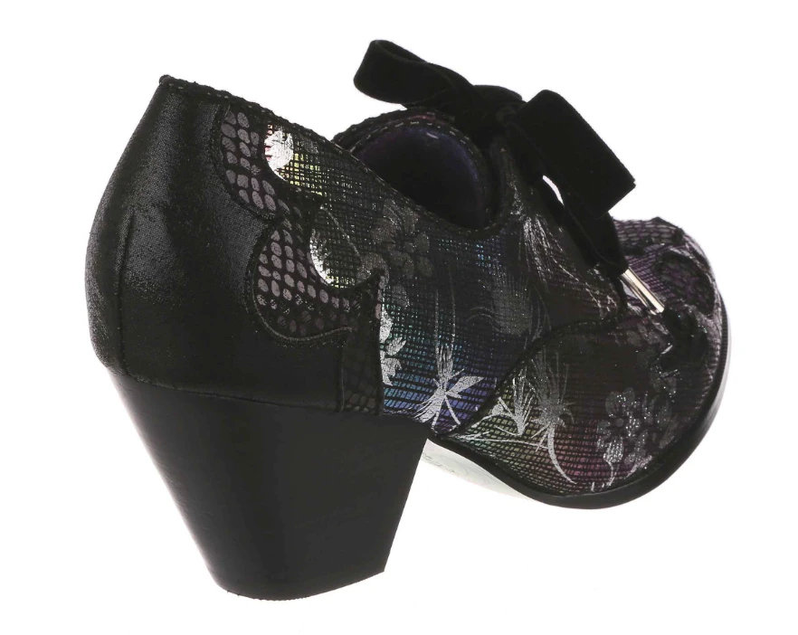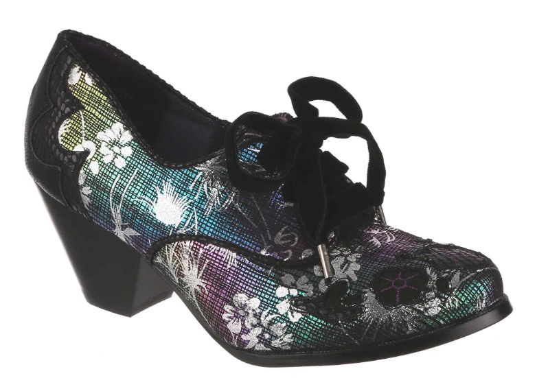 This Cuban heel cutie is sure to get your pulse racing! A fabulous dark rainbow shimmer is topped with a silver print of flowers, this, in turn, has been paired with textured black scalloping and super luxe velvet laces! Great to pair with trousers, or a skirt and some snazzy tights – a fun and wearable pair of shoes that are great to add some wow to your wardrobe!