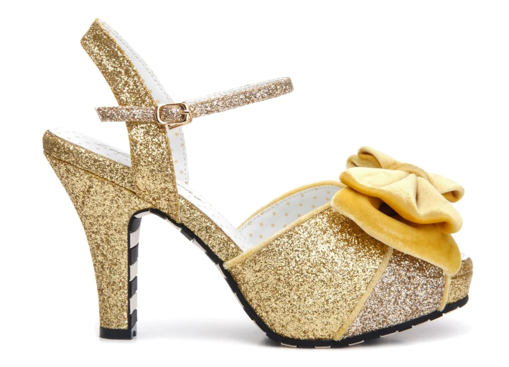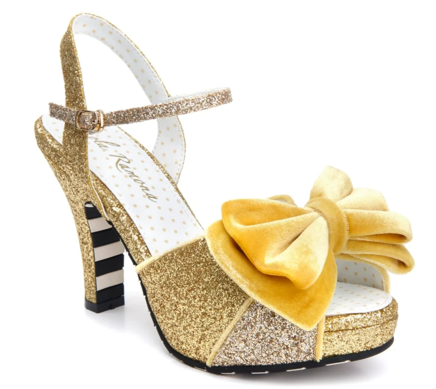 This beautiful gold glitter sandal with an oversized velvet bow is sure to be the star of the show! It’s very comfortable and the platform gives you extra height!