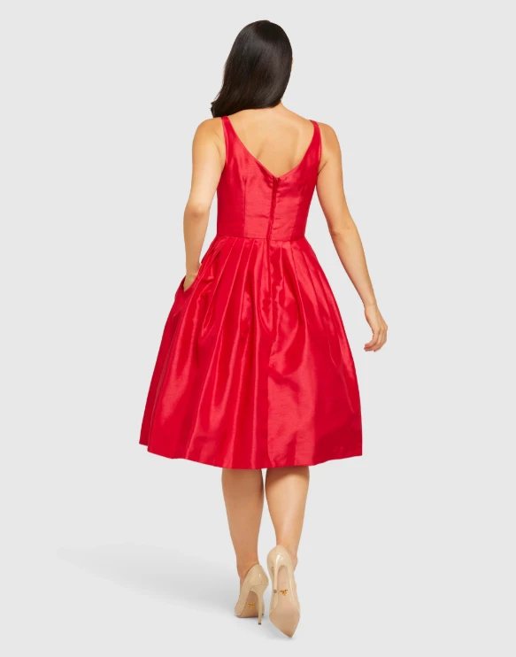 This Beautiful Vintage inspired dress has a sweetheart shaped neckline with a cross over which is great for all bust sizes. It has a fitted waist, and the skirt has wide tucks and seam pockets. It is in a striking Red Shantung and is perfect for any formal occasion!