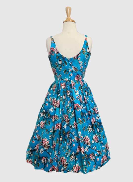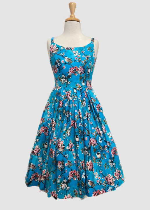 Oh so pretty! Beautiful Vintage inspired dress in beautiful bright blue with pretty cherry blossom pink floral detail. This gorgeous dress has wide adjustable straps and a double pleated skirt with side seam pockets.Â