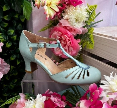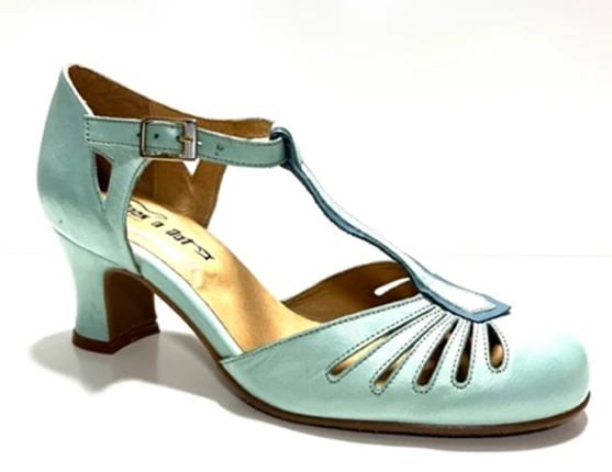 These Beautiful vintage inspired mid heels are in the softest leather that is just heaven on your feet! This pair is in a vibrant soft green blue leather with a soft blue piping.