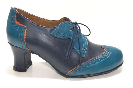 These Adorable vintage inspired mid heel booties are in the softest leather that is just heaven on your feet! This pair is in a versatile navy, with petrol contrasts and a hint of orange in the piping!