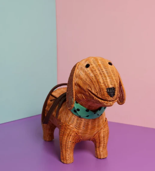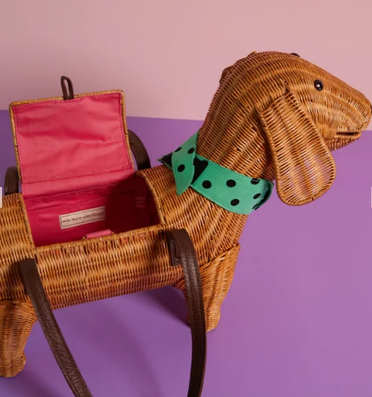 Introducing: Andouille the Sausage Dog in a neutral wicker with a set of brown leather handles, and detachable cotton shirt-style collar.Â